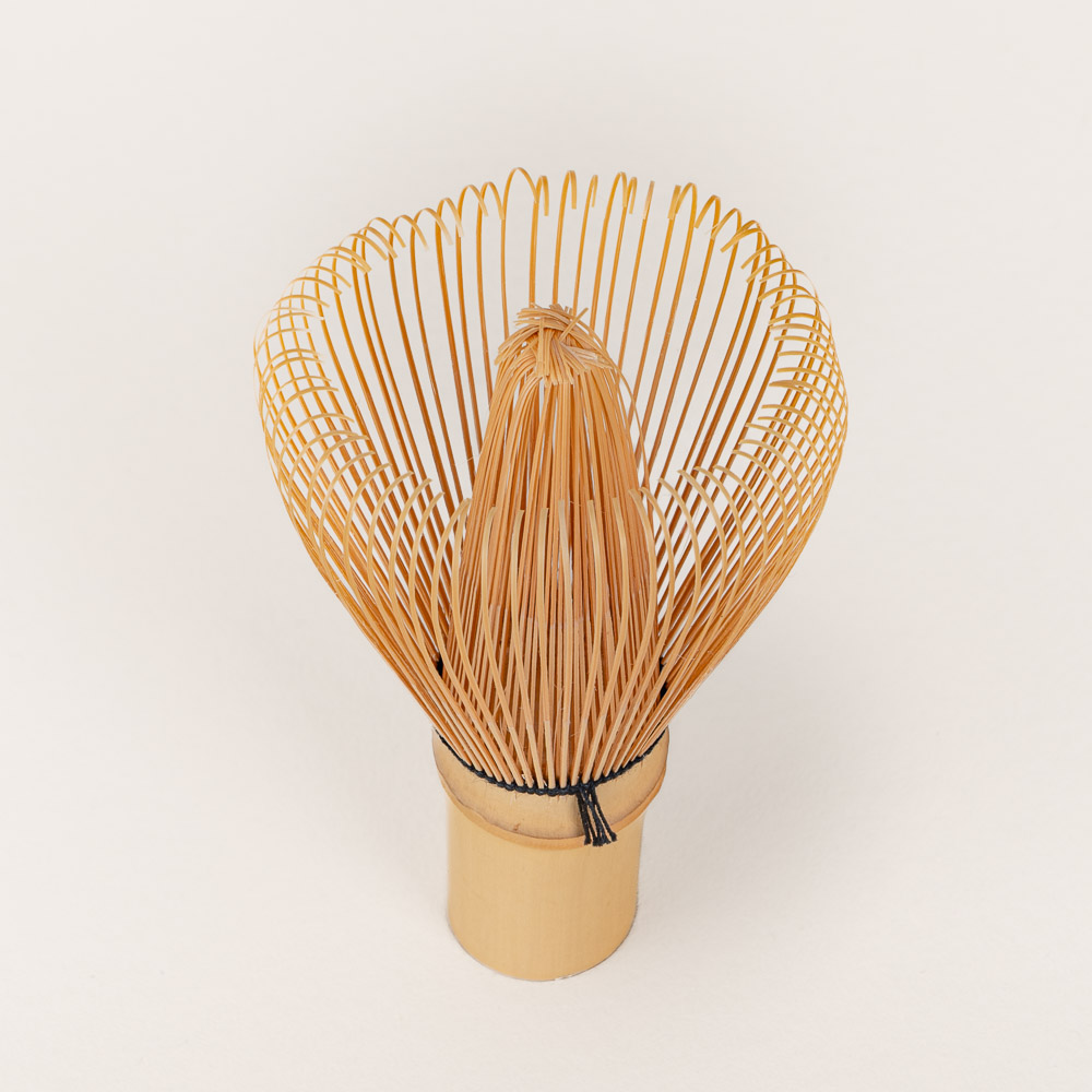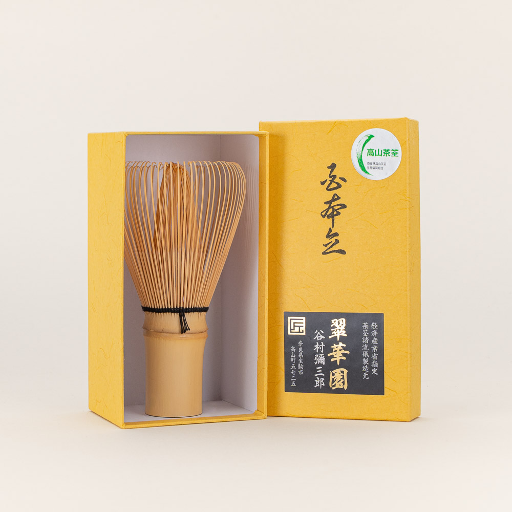 Authentic Japanese 100-tine Hachiku (white bamboo) chasen (matcha whisk) handcrafted by master chasen artisan, Yasaburo Tanimura, one of 18 remaining chasen masters in Japan. Tanimura-san handles the complete cycle from growing the bamboo to hand-splitting and shaping. He is the 25th generation headmaster of his family's 500 year old lineage in the bamboo discipline, and nationally recognized as a traditional artisan of this endangered craft.