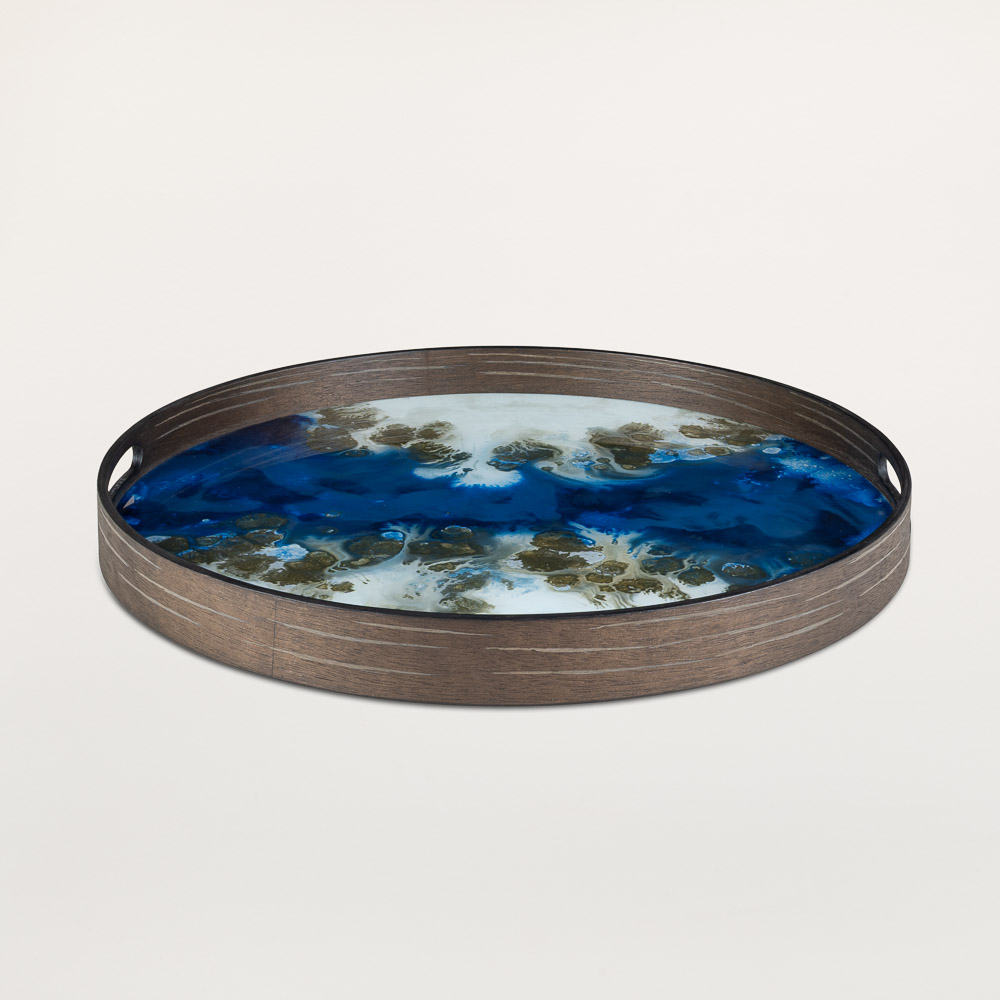 Ethnicraft presents their full-sized Arctica coffee bar tray, featuring a hand-painted design of ice caps with iridescent gold and silver highlights. A dark wood border frames the design under a smooth glass surface calling attention to any table or countertop. The size is generous enough to handle larger wares and accessories, conveniently accommodating full coffee bar arrangements and entertaining larger parties.