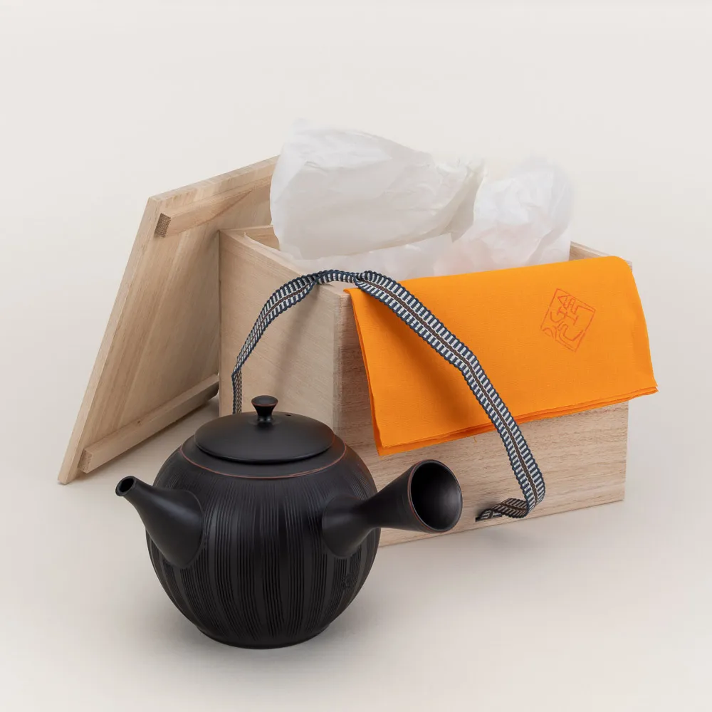 Masterfully crafted by artisan Reiko Koie at Tokoname-yaki kiln, one of Japan’s six ancient kilns dating back to the 12th century. Koie-san is one of several master artisans from this region who have have been officially designated as Intangible Cultural Property Holders. This blackened kushime teapot is appropriately presented in a paulowina wood (princess wood) box stamped with the artisan's kiln mark.