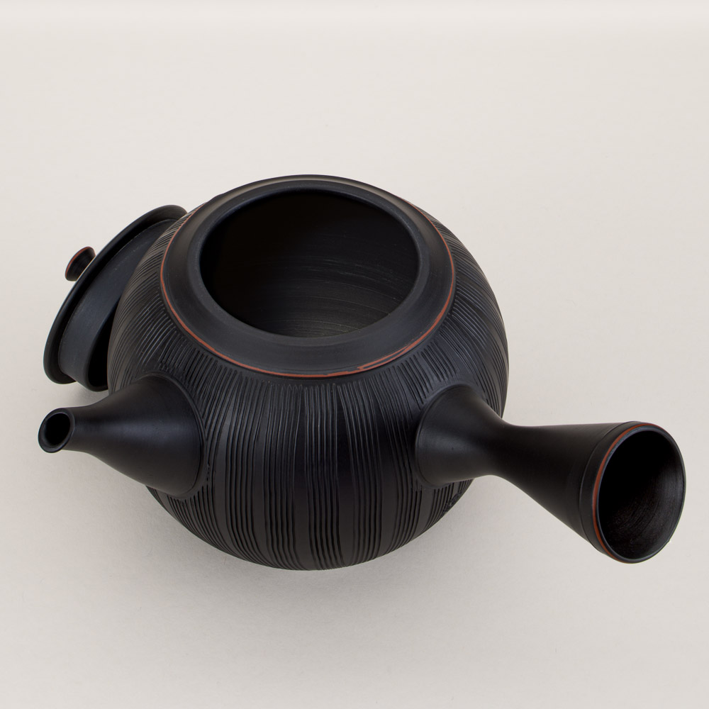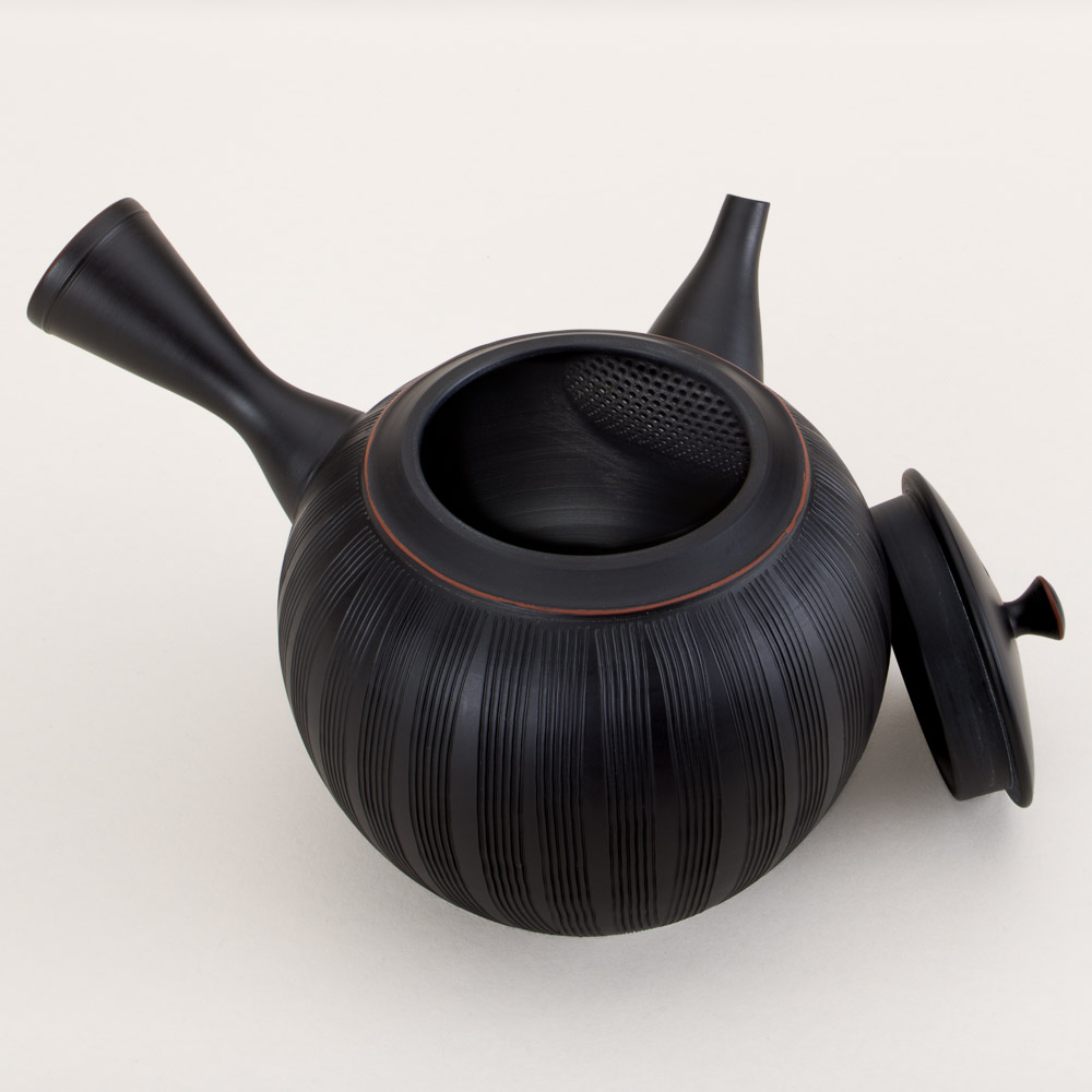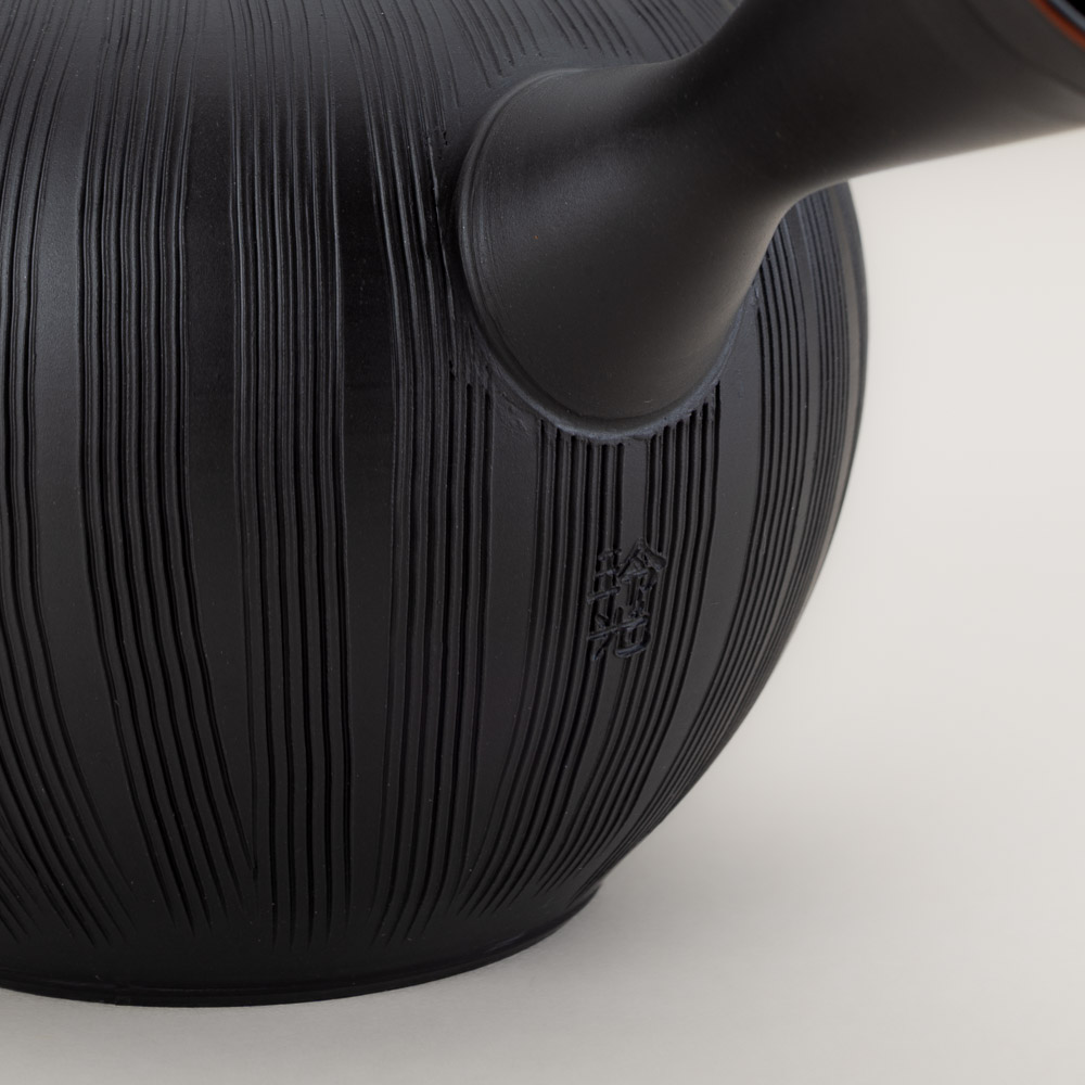Finely crafted kushime (comb-lined) teapot made from a dark variation of Tokoname’s famous red shudei clay and fired in a reduction chamber, which causes the natural clay surface to transform into a rich matte black patina. It is finished in the shudashi (vermillion) style by removing of a thin layer of the blackened surface on subtle details to reveal the original color of the clay. The clay sasame (fine mesh) filter ensures a smooth pour, making it ideal for all types of loose-leaf tea. Tokoname teapots are prized for enhancing the flavor of fine tea and bringing out the sweetness of green tea in particular.