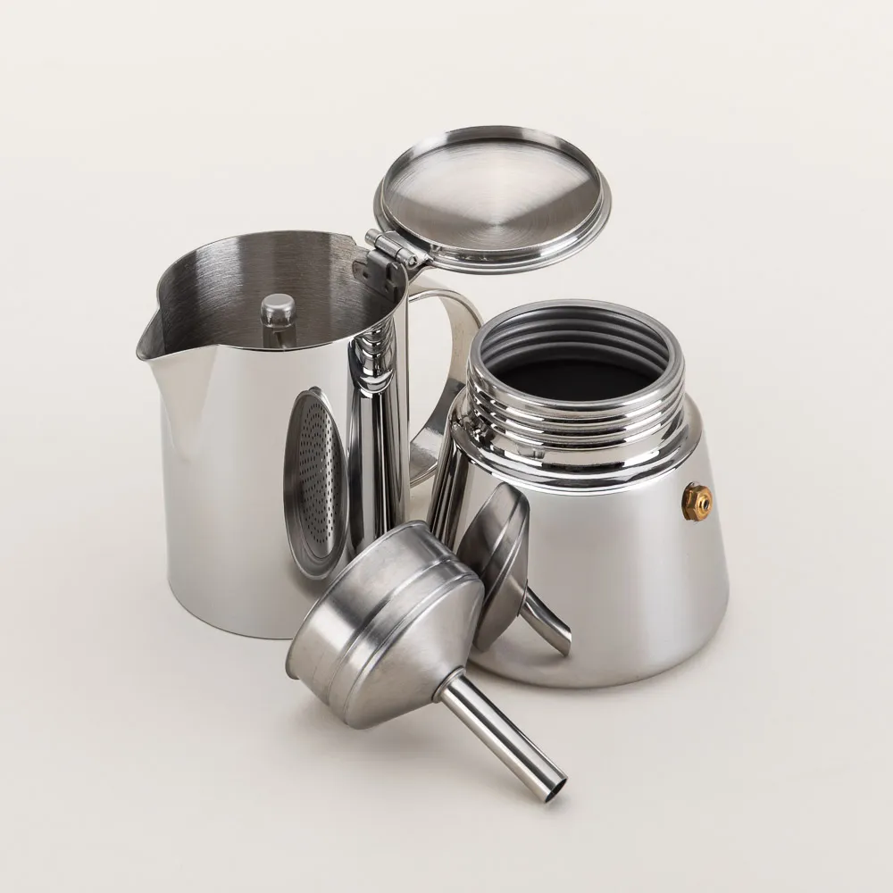 Cilio ‘Aida’ Stovetop Espresso Maker offers all the richness of a classic espresso without losing the flavor nuances of a French press brew. Made with 16/22 surgical-grade stainless steel, it can be used on gas, electric, or induction cooktop. Unlike café espresso machines intended for speed rather than subtleties, the Cilio espresso maker uses gentle steam pressure in a simple design to produce smooth, bold shots; it comes in a polished finish and is available in two sizes.