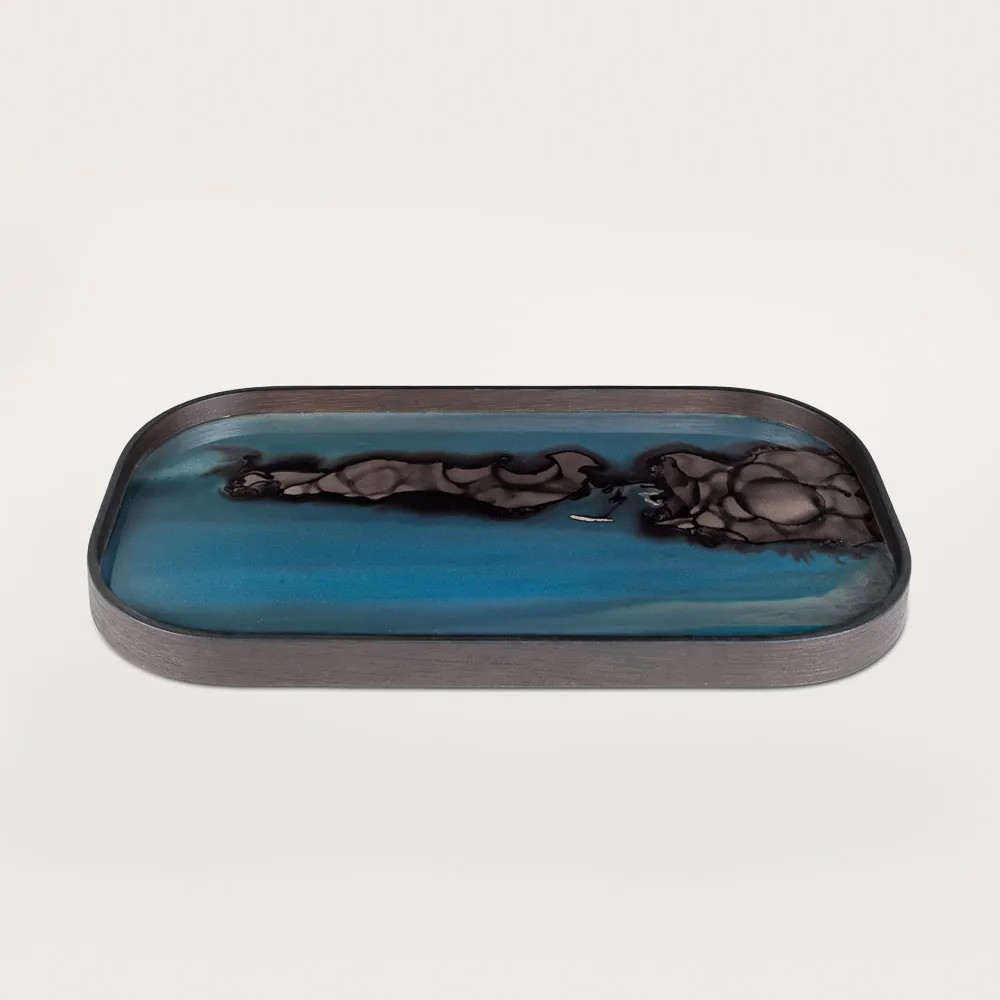 Ethnicraft presents their medium-sized Ebru serving tray, featuring a wood-framed oil & water design under a smooth glass surface. The convenient size offers versatility for use on coffee tables and shallow countertops, accommodating espresso, tea, or matcha arrangements. Suitable for the daily display of comfort drink wares and sweeteners or entertaining small groups.
