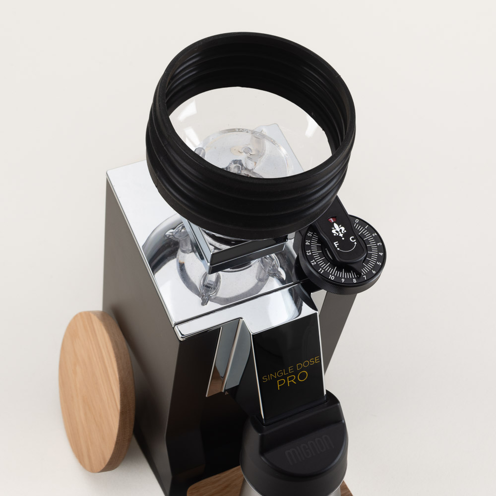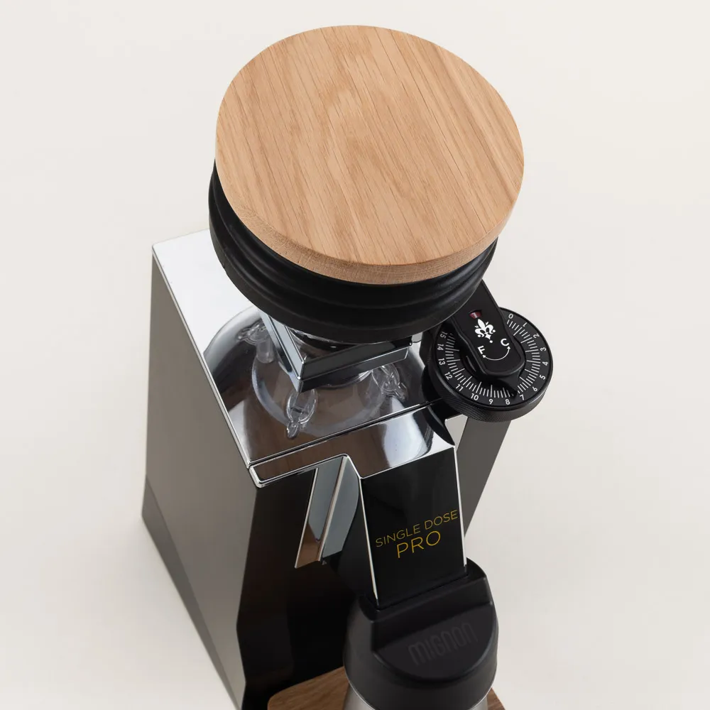 The Oro Mignon Single Dose Pro is an advanced coffee grinder for home baristas who require precision and versatility. This compact grinder is made in Italy and features a 15° tilt for direct-path grinding with zero bean retention; beautifully finished in black and chrome with wood-accents.