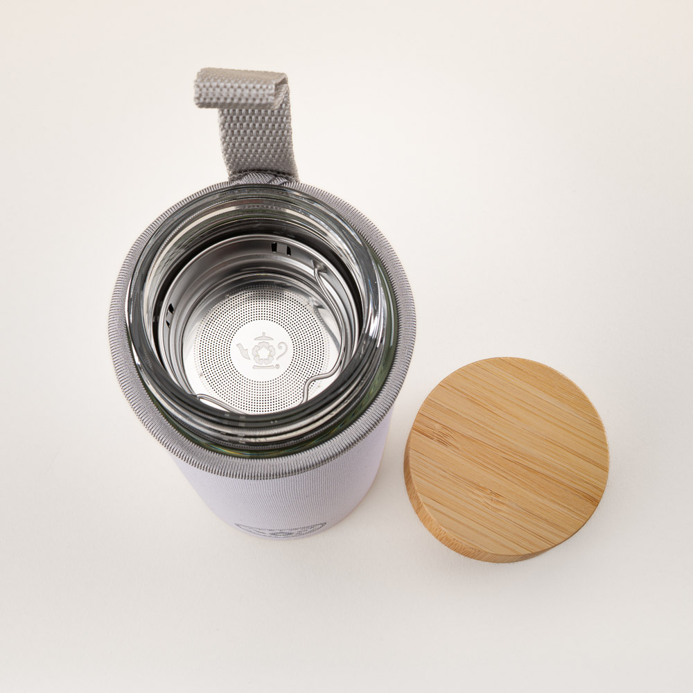 Borosilicate glass, 18/8 stainless steel, organic bamboo lid, neoprene sleeve