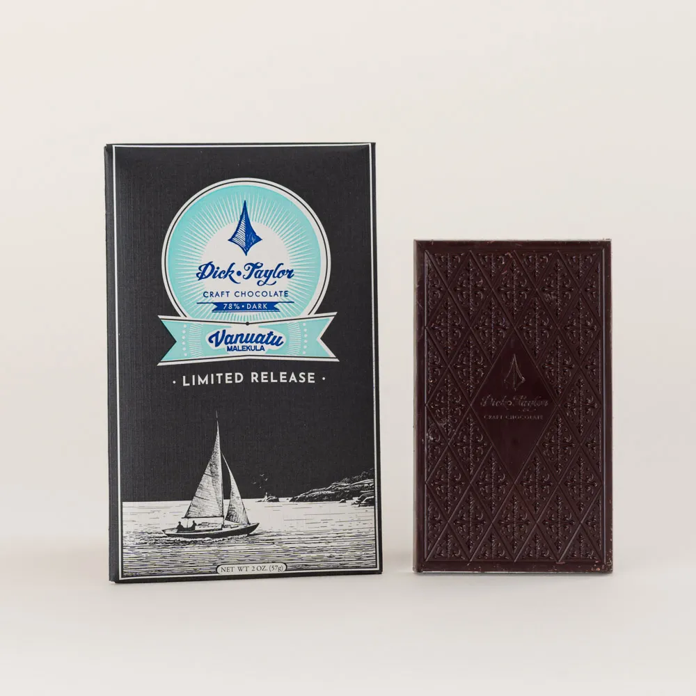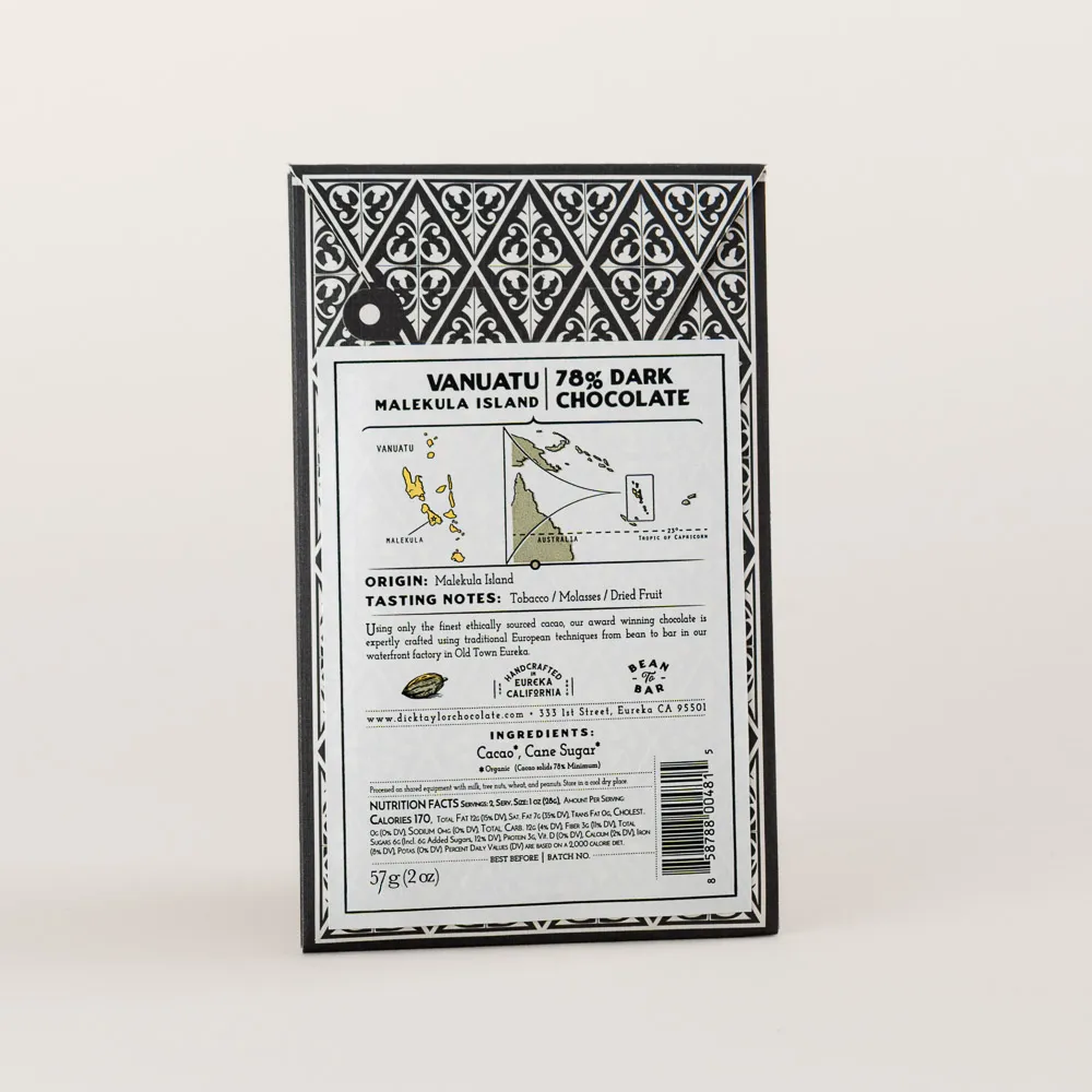 Dick Taylor's limited release, single-origin organic chocolate bar begins with exceptional cacao from Malekula Island, located in a remote part of the South Pacific. Made with organic Vanuatu cacao and organic Brazilian cane sugar; prepared using European chocolatier methods to produce a truly unique chocolate bar.