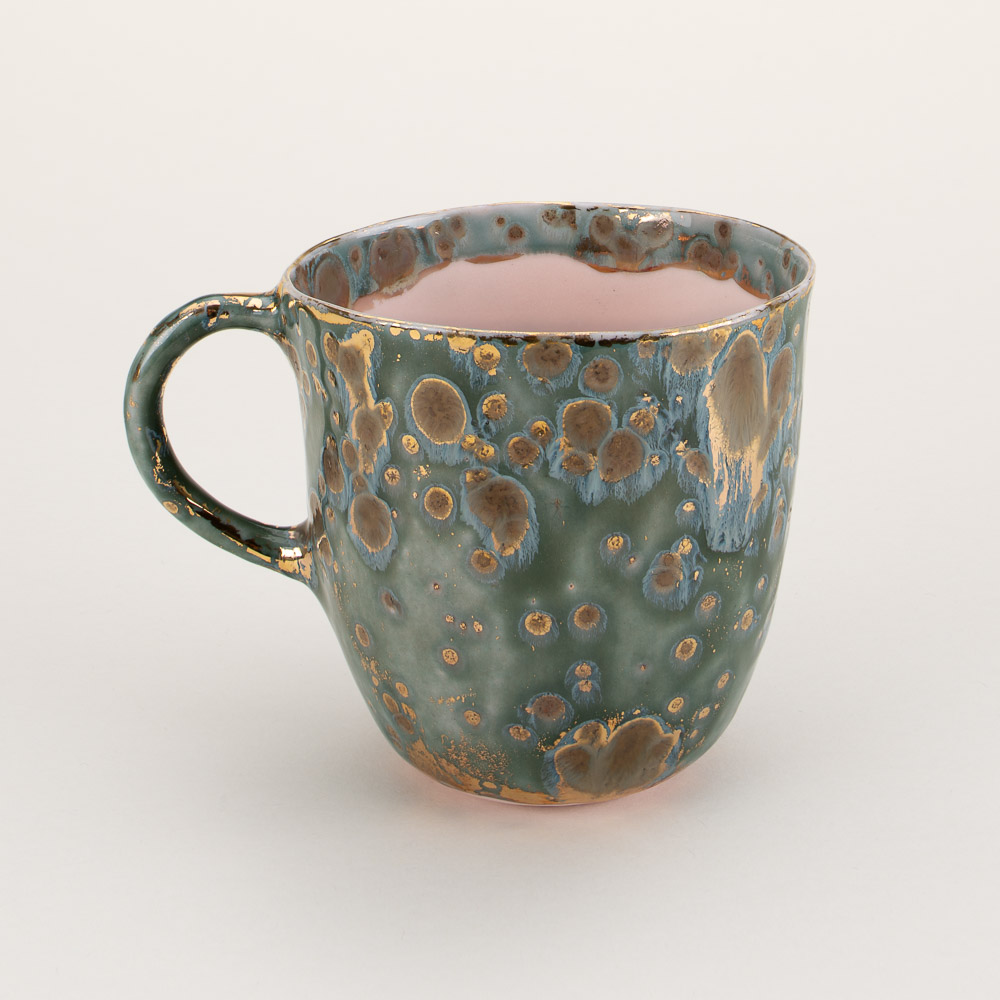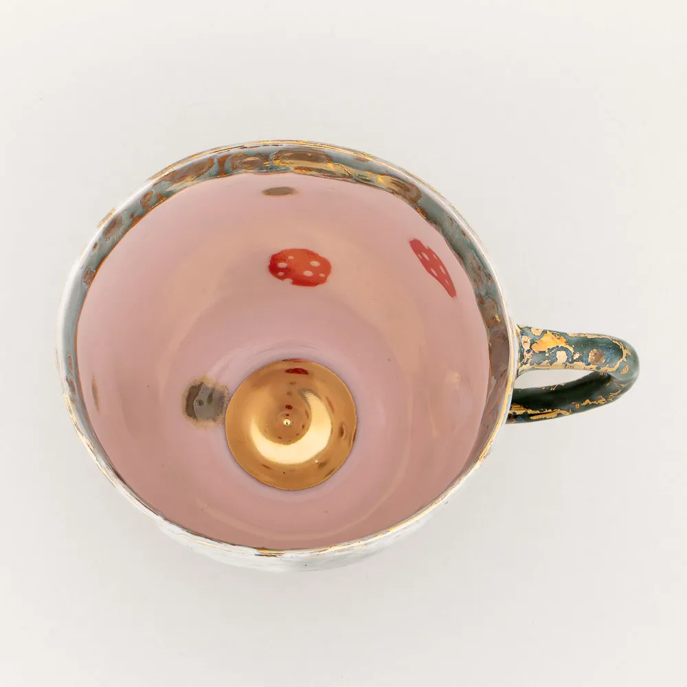 Each mug is handmade with 18k gold detailing. They are individually crafted at the Maiuri studio as one-of-a-kind pieces, with variations in glaze, color, and artistic impression. The images provided are representative of and comparably similar to the wares available for purchase.