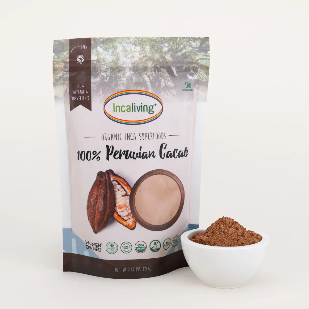 IncaLiving organic cacao is harvested in the wild Peruvian jungle at the foothills of the Andes, organically grown and gathered in the late summer months when the harvest is ripe. Whole beans are separated, sun-dried, and ground into a fine powder using modern stainless steel equipment.