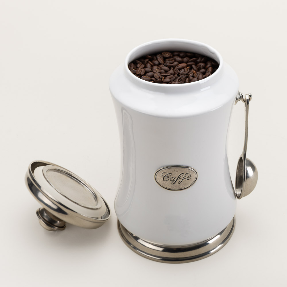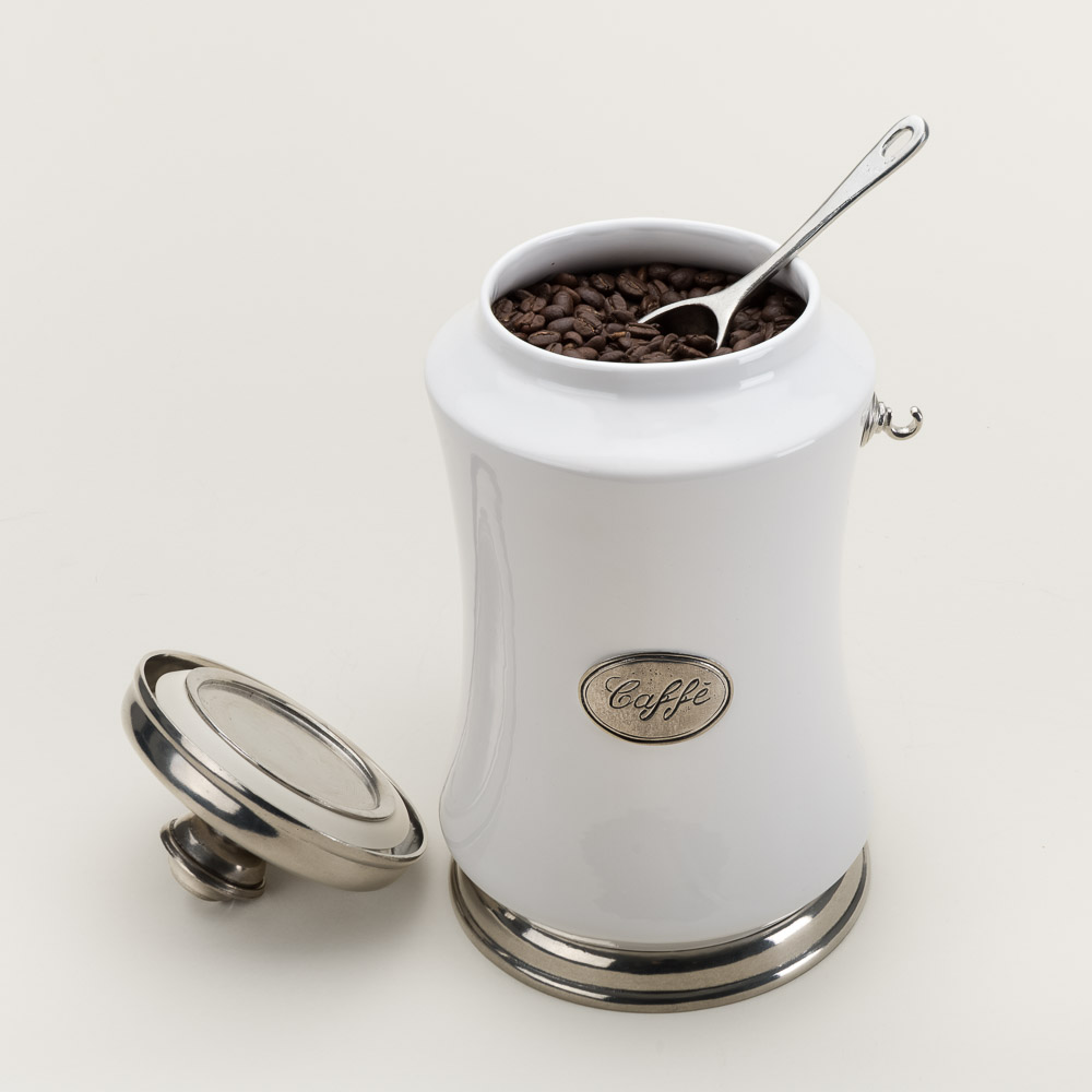 Arte Italica presents an albarello-style coffee keeper as a part of their Tuscan Collection, offering this handcrafted jar in bianco ceramic and rustic pewter, made in the traditional ways of Tuscan pottery and Lombardy metal-craft. The hourglass figure dates back to the Medici period, originally flourished and ornate. Hand-glazed in pure white with a caddy spoon and a seal in the pewter lid to keep coffee fresh. The Tuscan albarello coffee keeper almost offers you the keys to a Tuscan villa, bringing relaxed Italian charm into any home.
