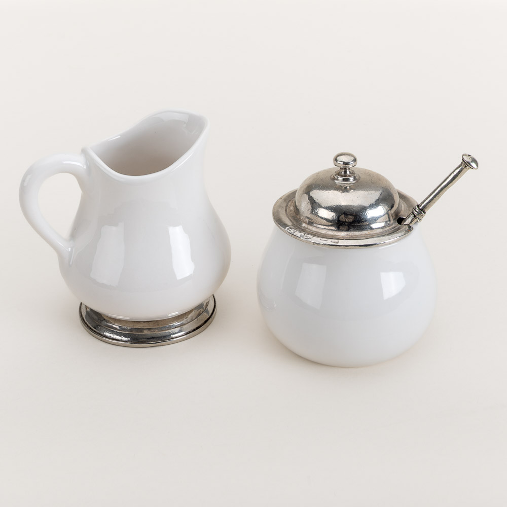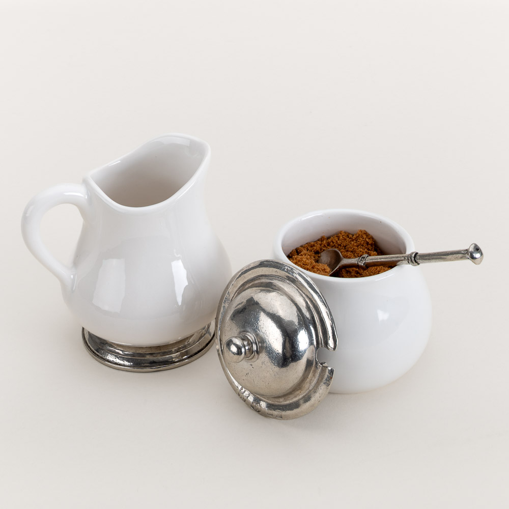 Arte Italica presents their creamer and sugar bowl with a spoon as part of their Tuscan Collection, offering the set in bianco ceramic and pewter, made in the traditional ways of Tuscan pottery and Lombardy metal-craft. This creamer and sugar bowl set brings relaxed Italian charm to the coffee table and the coffee bar.
